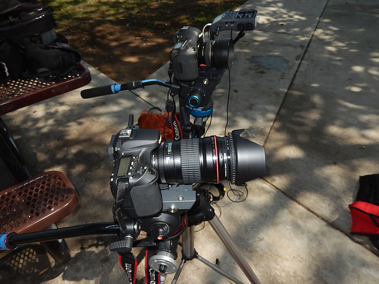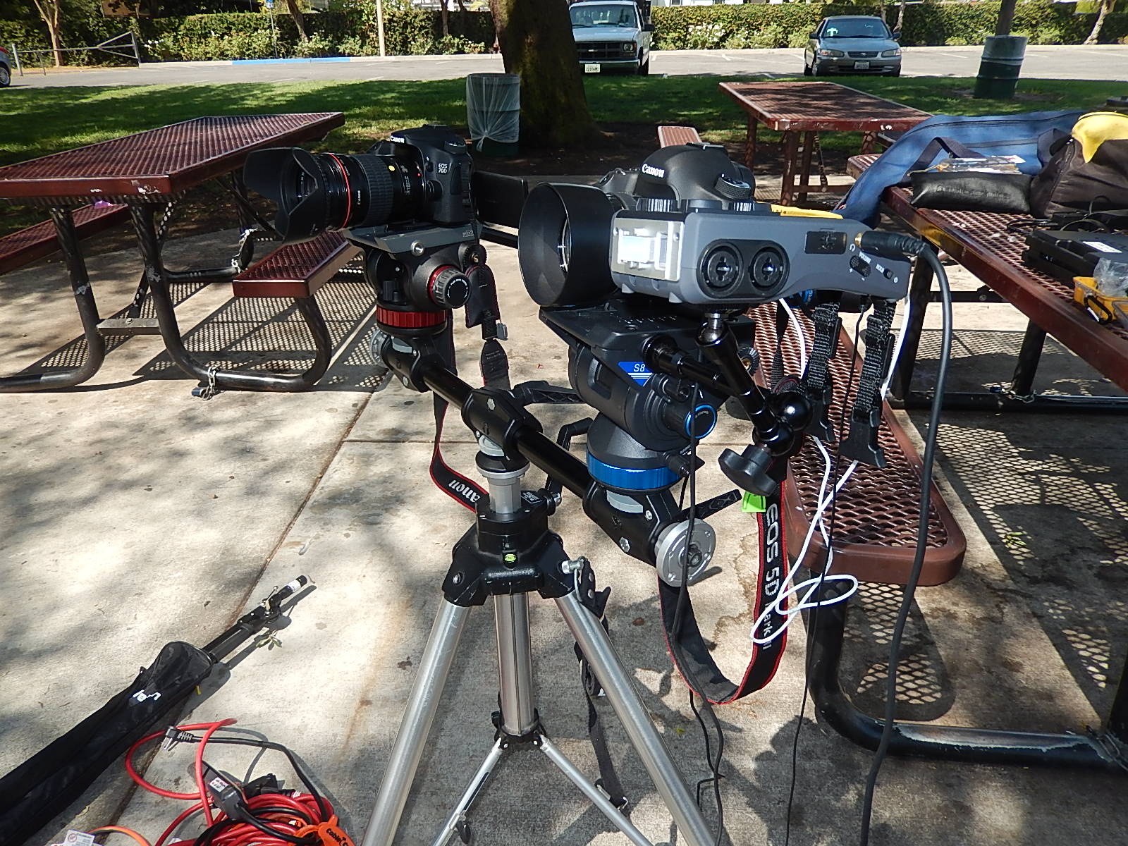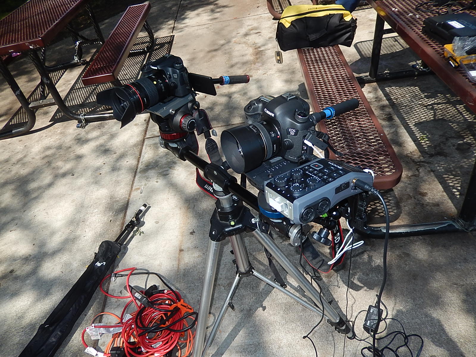The Manfrotto 2 camera rail makes it easy to shoot with both cameras from nearly the same vantage point on one tripod. Be sure to crank the mounts so they don’t rotate!!