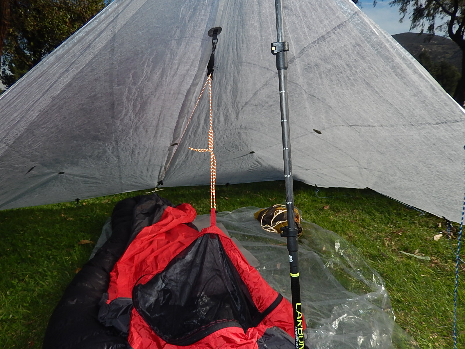 I’m finding that using trees at one or both ridgeline points as anchors yields very strong, versatile attachments for a wide variety of tarp rigs (especially more complex setups also using poles) and sticks easily exceed the heights of my trekking poles where I want to pitch a flying diamond, for example.DSCN1715